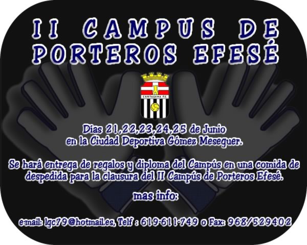 El II CAMPUS DE PORTEROS EFESÉ organizado por el Cartagena F.C. tendrá lugar los días 21, 22,23, 24 y 25 de Junio de 2010 en la Ciudad Deportiva Gómez Meseguer, para chavales nacidos entre 1991 y 2004.