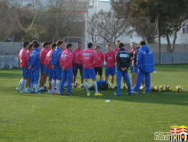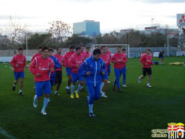 La sesión de una hora de entrenamiento, comenzó con una charla del cuerpo técnico, seguida de unas vueltas de calentamiento para terminar con ejercicios de balón.