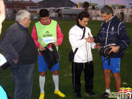 Finalizado el entrenamiento y tras entablar una charla con Raúl Agné (entrenador del Recre), Don José Gómez Meseguer hizo entrega de insignias de oro del Cartagena F.C. y algunos souvenirs del Efesé a Carlos Carmona y a Santisteban.