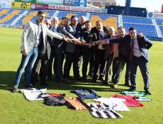 Los nuevos 'clubes afiliados' se han presentado este miércoles sobre el césped de La Condomina junto a Miguel López y Juan Fernando Serrano, vicepresidentes del UCAM Murcia CF; y José Luis Mendoza García, director de relaciones institucionales; Pablo Rosique, director general de Deporte; y Samuel Mendoza, director TIC y Multimedia de la Universidad Católica de Murcia.